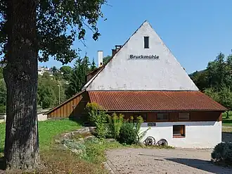 Im Jahr 1906 gehörte die Bruckmühle August Sax und hatte zwei oberschlächtige Wasserräder. Sie hatten einen Durchmesser von 2,95 m bzw. 3 m und eine Breite von 1,60 m bzw. 1,88 m und lieferten bei 300 l/s Wasserzufluss eine Rohleistung von 14 PS. Anfang des 20. Jahrhunderts hat Lina Sax die Wasserräder durch eine Francis-Turbine ersetzt. Im Jahr 1937 ist dann zur Unterstützung der Wasserkraft ein Elektromotor mit 10 PS Leistung hinzugekommen. Der Mühlenbetrieb wurde 1956 von Fritz Eugen Sax eingestellt.[3]