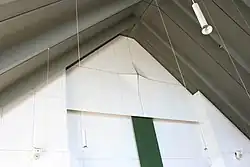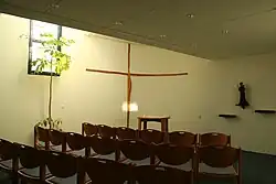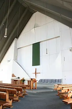 Die Kirche besitzt auf der südlichen Frontseite zwei Zugänge zur Kirche. Unter der Orgelempore hindurch gelangt der Besucher in den Kirchenraum, der durch die zeltförmige Dachkonstruktion geprägt wird. Die Bänke für die Gottesdienstgemeinde sind um den Altarraum gruppiert, der um eine Stufe etwas vom Raum für die Gemeinde erhöht ist.