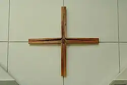 Aus dem Fichtenholz des ersten Wandkreuzes der Kirche schuf Primo Lorenzetti ein gleichschenkliges Kreuz, das im Foyer des 1994 neu errichteten Pfarreizentrums angebracht wurde. Auf Wunsch des damaligen Generalvikars und Weihbischofs Peter Henrici gestaltete Primo Lorenzetti an der Chorwand der Kirche hinter dem Altar ein weiteres Kreuz, dessen Gestaltung die Vision des Bruder Klaus vom Gnadenbrunnen aufgreift: Die Arme des gleichschenkligen Kreuzes sind von der Mitte nach aussen schmal und hoch, nach aussen breit und tief. Dies symbolisiert die Gnade Gottes den Menschen gegenüber. In der Mitte dieses Kreuzes befindet sich ein Bergkristall aus dem Kanton Uri. Dieser Kristall besitzt die Eigenschaften eines Prismas, welches das Licht in das Farbspektrum bricht. Im Kreuz hinter dem Altar eingefügt, verweist der Kristall auf das Licht als Gottessymbol. Zwischen diesem Kreuz hinter dem Altar und dem Kreuz im Giebelfeld der Altarwand hängt ein Tuch in der jeweiligen liturgischen Farbe. Die nicht verwendeten Tücher befinden sich hinter dem Giebelsegment der Altarwand und können bei Bedarf heruntergelassen werden.