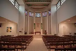 Im Innern spannen sich die Hochmauern des Mittelschiffs als horizontale Träger direkt von der Orgelempore bis zum Altarraum.[15] Möglich gemacht wird das durch die Verwendung von Eisenbeton. Indem diese Konstruktion einen (bis auf die beiden Stützen der Orgelempore) säulenfreien Innenraum schafft, ist von den ursprünglich 520 Sitzplätzen ein freier Blick auf den Altarraum vorhanden. Bei der heutigen Bestuhlung bietet die Kirche noch 350 Sitzplätze. Die hohe Wand über den Seitenschiffen, die durchgehenden Fensterbänder und der kräftig ausgebildete Deckenunterzug prägen den Kirchenraum.[16]