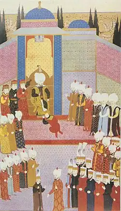 - ↑ Vgl. Konrad Dilger: Untersuchungen zur Geschichte des osmanischen Hofzeremoniells im 15. und 16. Jahrhundert (= Beiträge zur Kenntnis Südosteuropas und des Nahen Orients. Bd. 4). Trofenik, München 1967 (zugleich Dissertation, Ludwig-Maximilians-Universität München 1967), S. 33.