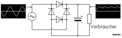 Wenn eine Wechselspannung mit Dioden gleichgerichtet wird, entsteht in der Mitte jeder halben Periode eine Spannungsspitze, die wieder auf Null abfällt (1. Abbildung rechts). Dieses Abfallen kann mit einem Kondensator verzögert, aber nicht verhindert werden. Somit entsteht in jeder halben Periode eine Differenz zwischen der Spitzenspannung und dem tiefsten Punkt der Kondensatorspannung vor dem Wiederanstieg (2. Abbildung). Diese so entstandene Spannungsdifferenz bezeichnet man als Restwelligkeitsspannung. Sie kann mit einem „gekoppelten TRUE-RMS-Messgerät“ (Effektivwert) gemessen werden.