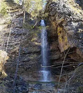 Er entspringt auf einer Höhe von 1610 m unterhalb des Fellhorns in den Chiemgauer Alpen und gelangt über mehrere Wasserfälle im Kreuzangergraben ins Tal. Dabei wird der Bach durch Zuflüsse von der Eggenalm über die Hasenauer Alm zusätzlich gespeist. In einem letzten Wasserfall oberhalb der Bäckalm (jetzt Einfangalm) stürzt das Wasser nochmals in die Tiefe und sammelt sich in einem lagunenartigen Becken.