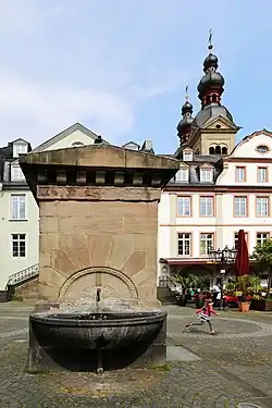 Auf der Ostseite des Brunnens ist eine Tafel mit lateinischem Text eingelassen. Der Text erinnert an den Kurfürsten Clemens Wenzeslaus von Sachsen und an den Wasserbaudirektor Georg Kirn, den Erbauer der ersten Koblenzer Wasserleitung von Metternich in die Koblenzer Innenstadt.[1]