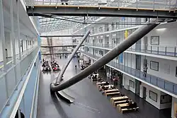Zwischen den beiden Treppenaufgängen, um 45 Grad im Raum geneigt, befinden sich zwei induktiv gebogene Stahlröhren mit einer Spannweite von ca. 45 Metern, die die Parabelfunktion z = y = hx² / d² darstellen. Diese Parabel verbindet die beiden Treppenaufgänge und interpretiert auf dynamische Weise die Funktion der zentralen Halle: Ein überdachter Straßenraum, der als Ort der Bewegung, vor allem aber der Begegnung und Kommunikation dient.[5]