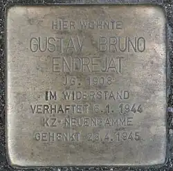 • Vor seinem Wohnhaus im Valentinskamp 42–43 hat der Aktionskünstler Gunter Demnig zum Gedenken an Bruno Endrejat einen Stolperstein verlegt.[2]