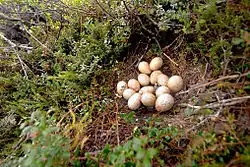 Gelege eines Tannenhuhns (Falcipennis canadensis) Die Durchschnittsgelegegröße dieser Art liegt bei 5 Eiern; ein 14er Gelege deutet auf die Beteiligung mehrerer Weibchen hin
