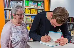Buchhändlerin und signierender Autor nach einer Lesung