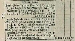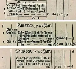 - ↑ Vgl. Fuggerarchiv, Dillingen 43, 2, zitiert in: Hermann Kellenbenz: Buchhaltung der Fuggerzeit. In: Vierteljahrschrift für Sozial- und Wirtschaftsgeschichte. Band 58, Nr. 2. Franz Steiner Verlag, 1971, ISSN 0042-5699, S. 228.
