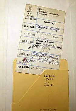 Eine Buchkarte ist ein Dokument im Bibliothekswesen, das bei der Verwaltung der Ausleihe von Büchern eingesetzt wird.