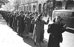 Ungarn war im Zweiten Weltkrieg seit 1941 ein Verbündeter des nationalsozialistischen Deutschen Reiches. Die deutsche Besetzung Ungarns (Unternehmen Margarethe) begann am 19. März 1944 und erfolgte nach dem Versuch Ungarns, sich vom verbündeten Deutschen Reich zu lösen. Rund ein Drittel der etwa sechshunderttausend Juden in Ungarn wurde bis Kriegsende ermordet. Die meisten von ihnen wurden ab 1944 von den Nationalsozialisten in das KZ Auschwitz deportiert.[7] Allerdings rettete der Einsatz mehrerer Diplomaten, darunter des Schweden Raoul Wallenberg und des Schweizers Carl Lutz, zahlreichen Budapester Juden das Leben und bewahrte sie vor der Deportation. Ab dem 3. April 1944[8] wurden Teile Budapests durch amerikanische und britische Luftangriffe zerstört. Die stärksten Verwüstungen erfolgten, als sowjetische Streitkräfte von Ende Dezember 1944 bis Anfang Februar 1945 die Stadt während der Schlacht um Budapest bis zur Einnahme belagerten. Die eingeschlossenen deutschen und ungarischen Truppen sprengten bei ihrem Rückzug auf die Budaer Seite des Kessels sämtliche Brücken über die Donau. 38.000 Zivilisten starben noch in dieser Kriegsphase.