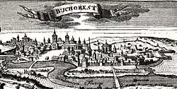 Unter dieser osmanischen Suzeränität erlebte das noch immer dörflich geprägte Bukarest durch die Anwesenheit des Hofes sowie durch die Rückkehr der ausländischen Händler einen Aufschwung. Die Bevölkerungszahl stieg und es entwickelte sich eine städtische Struktur, die durch eine Vielzahl neuer Gebäude zum Ausdruck kam. 1545 errichtete Fürst Mircea Ciobanul die erste Stadtmauer in Form eines Palisadenwalls.[18] Auch ein großer Teil des die Stadt umgebenden landwirtschaftlich genutzten Landes wurde nun als „das Land der Stadtbürger“ (moșia orășenilor) mit Grenzsteinen markiert.