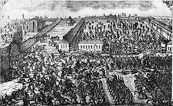 Dreißig Jahre später erhob sich die Bukarester Bevölkerung in den Jahren 1574 und 1575 sowie im Jahr 1594 gegen die wachsenden Tribute der Hohen Pforte. Zudem beteiligte sie sich an den Kämpfen Mihai Viteazul (Michael der Tapfere) gegen die osmanische Armee, die aber letztlich erfolglos blieben.[19] Nachdem dieser von den Osmanen abfiel, eroberte im August 1595 Großwesir Koca Sinan Pascha nach der Schlacht bei Călugăreni die Stadt. Dabei kam es zu einem Stadtbrand. Im Herbst desselben Jahres kam es in der Nähe von Bukarest zu einer weiteren Schlacht, bei der sich die Türken zurückzogen und dabei einen Teil der Stadt zerstörten. Aus diesem Grund verlagerte man anschließend den Fürstensitz bis 1626 nach Târgoviște. Kurz nach seiner Machtübernahme verlegte Fürst Alexandru Coconul am 10. November 1626 die Residenz wieder nach Bukarest.