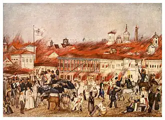 Dem großen Brand im städtischen Geschäftsviertel am 23. März 1847 fielen etwa 2.000 Häuser zum Opfer. Ihm folgte ein planmäßiger Wiederaufbau.[26] Im folgenden Jahr war Bukarest Zentrum der Walachei-Revolution. Die am 11. Juni 1848 begonnene Revolution wurde drei Monate später am Abend des 13. September am Spirei-Berg blutig niedergeschlagen. Ein Denkmal erinnert an dieser Stelle an das Ereignis. Zwischen den Jahren 1853 und 1856 wurde Bukarest nacheinander von russischen, türkischen und österreichischen Truppen besetzt.[27]