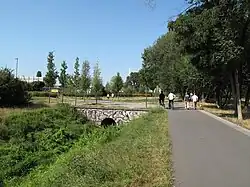 Durch die Kurze Straße geht es weiter zur Schulstraße. Im Nordwesten der Grünfläche befand sich das Flughafengelände Staaken und das Gebiet kam durch einen Gebietsaustausch der Alliierten als West-Staaken auf DDR-Gebiet (Kreis Nauen).[10] Auf der Schulstraße geht es rechts weiter durch die gegenüberliegende Grünfläche an die Eigenheimsiedlung am Gummiweg. Westlich vom Wege in der Grünfläche liegt nun der Bullengraben. Der Bullengrabenweg führt weiter über das westliche Ende der Hauptstraße zum Philipp-Gerlach-Weg. Im Weiteren wird durch den nicht mehr vorhandenen Mauerstreifen West-Staaken verlassen und der Bullengrabengrünzug erreicht. Der Bullengraben selbst liegt hier an der Südkante des Grünzugs. Im Norden liegt das Staakener Mühlenviertel, eine um 2000 errichtete Wohnanlage mit mehrgeschossigen Reihenhäusern.