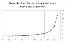 Aufgrund der großen Kräfte, die am Bullenstander angreifen können, sollte dieser so weit wie möglich nach vorne geführt werden.[3] Um die Belastung der Bullenstanderleine zu minimieren, wäre eine Befestigung im 90-Grad-Winkel zum aufgefierten Baum optimal. Dies ist jedoch in der Praxis nicht möglich, da sich dort nur Wasser befindet. Das nebenstehende Diagramm veranschaulicht den Zusammenhang zwischen dem Winkel des Bullenstanders zum Baum und der Mehrbelastung der Leine. Ist der Winkel kleiner als 25 Grad, nimmt die Belastung der Leine überproportional zu und kann einen Verstärkungsfaktor deutlich über 10 erreichen. In diesem Fall müsste eine Leine eingesetzt werden, die mindestens das Zehnfache der Bruchlast aushält als im optimalen Fall.[4] Zusätzlich ist oft am Bullenstander im Vergleich zur Großschot keine Talje (Flaschenzug) vorhanden, und die Leine wird mit einem Palstek festgeknotet, nicht mit einem gespleißten Auge – beides erfordert eine weitere Erhöhung der nötigen Bruchlast.