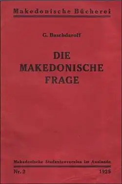 Die Makedonische Frage, herausgegeben von den Makedonischen Studentenvereinen im Auslande. Autor ist der IMRO-Revolutionär und Journalist Georgi Baschdarow, welcher zu einem der insgesamt drei Auslandsvertreter der IMRO gehörte