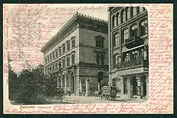 Anfang der 1890er Jahre erteilte die ehemalige Reichsbank den Auftrag für den Bau einer repräsentativen Zweigstelle, die dann in den Jahren von 1894 bis 1896 nach Plänen des Königlichen Regierungs- und Baurats Max Hasak in Hannover errichtet wurde. Dieser gestaltete das in Deistersandstein verwirklichte Bauwerk in Anlehnung an die italienische Palastarchitektur der Renaissance. Bei der Ausgestaltung der Fassade erhielt er Unterstützung durch den Bildhauer Hermann Miethke,[2] mit dem er schon beim Bau der Berliner Bonifatiuskirche zusammengearbeitet hatte.[3]