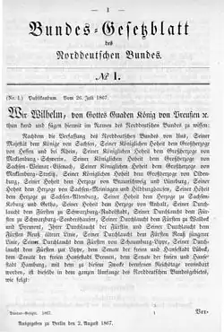 Das Bundesgesetzblatt des Norddeutschen Bundes wurde durch die Verordnung betreffend die Einführung des Bundesgesetzblattes für den Norddeutschen Bund vom 26. Juli 1867 eingeführt und diente der Verkündung der Bundesgesetze (des Norddeutschen Bundes) und der Anordnungen und Verfügungen des Bundespräsidiums. Ausgabeort war Berlin, die Herausgabe erfolgte im Büro des Bundeskanzlers (des Norddeutschen Bundes).