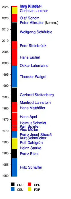 Lars KlingbeilJörg KukiesChristian LindnerOlaf ScholzPeter AltmaierWolfgang SchäublePeer SteinbrückHans EichelOskar LafontaineTheodor WaigelGerhard StoltenbergManfred LahnsteinHans MatthöferHans ApelHelmut SchmidtKarl SchillerAlex MöllerFranz Josef StraußKurt SchmückerRolf DahlgrünHeinz StarkeFranz EtzelFritz Schäffer