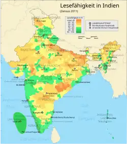 → Census of India 2011: Table 2(3) Literates and literacy rates by sex: 2011. Government of India, Neu-Delhi 2011 (? Fragment, provisorisch, ohne Telangana; englisch; PDF: 10,5 kB, 1 Seite ( vom 9. April 2011 im Internet Archive). - ↑ The Economist: Comparing Indian states and territories with countries – An Indian summary. ( vom 10. Februar 2014 im Internet Archive) 2011 (englisch).