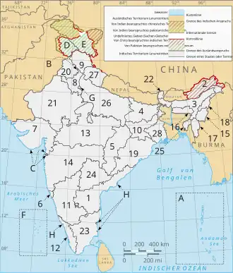 - Am 31. Oktober 2019 wurde Ladakh (auf der Karte: E) als separates Unionsterritorium (ohne eigene Legislative) abgetrennt vom neu gebildeten Unionsterritorium Jammu und Kashmir (auf der Karte: D).[2][3] Diese Liste enthält Daten des bis dahin bestehenden Bundesstaates Jammu und Kashmir. Die indische Zentralregierung veröffentlichte Werte einer ungeteilten Gesamtregion Kaschmir,[4] beispielsweise 222.236 km² Fläche im Jahr 2011 (faktisch stehen aber nach wie vor nur rund 100.000 km² unter indischer Kontrolle).