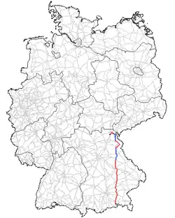 - ↑ Westlich von Hof vierstreifig; in Hof, im Raum Regensburg, nordöstlich von Landshut und südlich von Rosenheim vierstreifig mit Trennstreifen