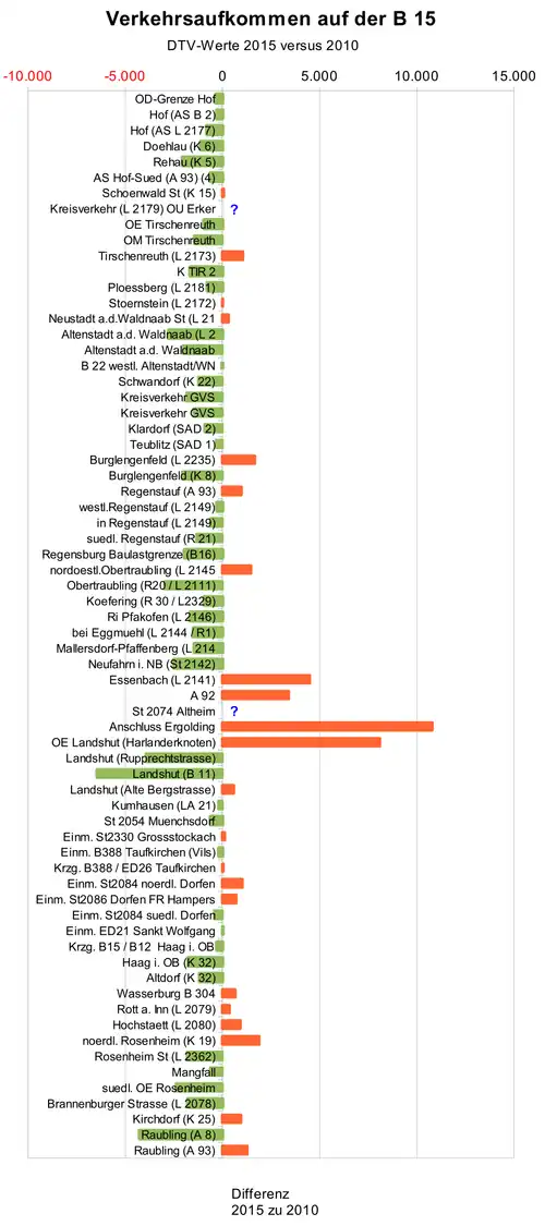 Mit Stand 2013 verkehrten auf der B 15 streckenweise etwa 10.000 und in einzelnen Bereichen bis zu 18.000 Kraftfahrzeuge pro Tag. Der Schwerlastanteil beträgt bis zu 27 Prozent.[4][5] Zwischen Regensburg und Rosenheim liegt gemäß nachfolgendem Diagramm mancherorts die Verkehrsbelastung bei 5000 Fahrzeugen täglich. In den Bereichen Landshut und Rosenheim liegen diese Werte durch den Quell- und Zielverkehr deutlich darüber. Die größte Verkehrszunahme entlang der B 15 fand zwischen den Jahren 1970 und 1990 statt, schwächte sich dann im Folgejahrzehnt ab. Zwischen 2000 und 2010 gab es keine wesentliche Verkehrszunahme; erheblich zugenommen hat dafür der Quell- und Zielverkehr im Raum Landshut und vor allem im Raum Rosenheim.
