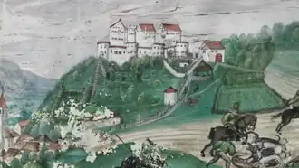![]() Burg und Einöde Angelberg um 1593 (colorierte Zeichnung) | ||