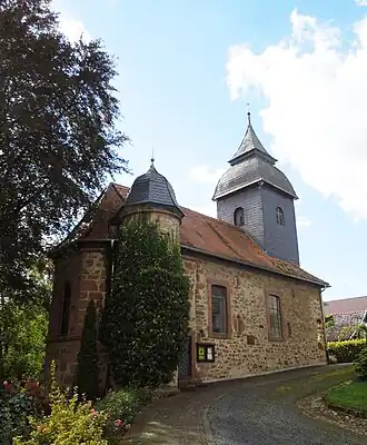 Fest steht, dass im 15. Jahrhundert eine spätgotische Wehrkirche mit befestigtem Kirchhof auf der Erhebung am Schwalmufer errichtet wurde, und man nimmt an, dass die Ummauerung des Kirchhofs zumindest teilweise mit Steinen der früheren Anlage aufgeführt wurde.[3] Die in dem heute als Garten genutzten Teil des einstigen Kirchhofs schon in geringer Tiefe gefundenen großen Steinplatten und Steine werden als Trümmerreste des alten Adelssitzes gedeutet.[5] Noch 1859 wurden Steine von dort für den Neubau der Schwalmbrücke verwendet.[6]