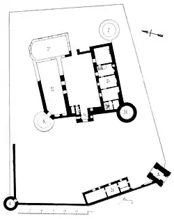 Vollständig erhalten oder wieder aufgebaut sind der südlich gelegene, dreigeschossige Palas und der sich daran anschließende runde Südwest-Turm der Burg sowie der aus Backstein errichtete Torbau der Vorburg. Letzterer stammt in seinem Kern zwar aus dem 14. Jahrhundert, wurde aber im 16. Jahrhundert überformt. Er besitzt einen quadratischen Grundriss mit einer Seitenlänge von 8,10 Metern.[3] Sein Spitzbogentor mündet in eine tonnengewölbte Durchfahrt. Darüber befindet sich im Obergeschoss ein Raum mit flacher Balkendecke. Den oberen Abschluss der Außenmauer bildet ein Spitzbogenfries, über dem sich ein einfaches Pyramidendach erhebt.