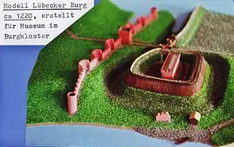 ![]() Modell der Lübecker Burg um 1220 vor Klostererrichtung (unten die Trave, oben die Wakenitz) | ||