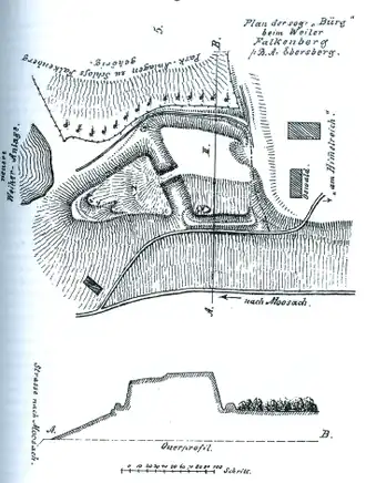 Historische Geländeaufnahme des Burgstalls Falkenberg mit Vor- und Hauptburg (1889)