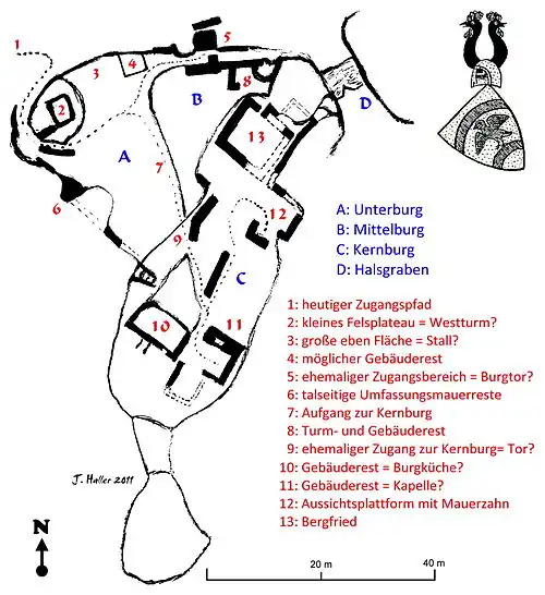 In vier Höhenstufungen erhebt sich das unregelmäßige und schwer fassbare Burgareal. Vereinfachend lassen sich vier Unterteilungen beschreiben.