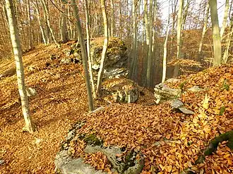 v.li.n.re.: Wall, Halsgraben mit Versturz und Burgfelsen -