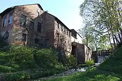 Die heutige Mühle wurde 1805 bzw. 1807 auf den Fundamenten des nördlichen Festungsturms der Ordensburg errichtet und 1820 für die Produktion von Papier umgebaut, das in Goldingen noch bis 1838 hergestellt wurde. Zum Betrieb der Mühle wurde der Bach Alekšupīte kurz vor seiner Einmündung in die Windau zu einem Mühlenteich aufgestaut. Das überlaufende Wasser gelangte dann über einen 4,15 m hohen und 8 m breiten natürlichen Wasserfall (dem höchsten Wasserfall Lettlands) in die Windau. Zum besseren Betrieb der ersten Papierfabrik Kurlands wurde der Wasserfall im 17. Jahrhundert verstärkt und ausgebaut.[17]