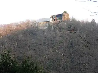 Erhalten sind der achteckige Bergfried[6] mit einer 2,5 Meter starken Schildmauer und integriertem Treppenturm. Hieran schließt sich der Palas-Bereich mit spitzbogigem Portal, Schlitzfenster, maulartiger Schießscharte und rundbogigem Portal an.[7] Im Innenhofbereich der Burg befindet sich ein in den Felsen gehauener Brunnenschacht von 2,5 Metern Durchmesser.[8] Die Burg wurde nach Süden durch einen tiefen Halsgraben gegen den höher liegenden Hang gesichert.