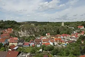 Burgruine Hohenfels – Ansicht des Felsrigels der Burg Hohenfels aus südlicher Richtung | ||