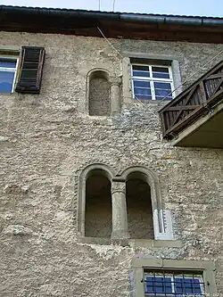 Die untere Burg besteht aus dem ältesten Gebäude der Anlage, dem heute von der Eigentümerfamilie bewohnten romanischen Turmpalas (in alter Literatur fälschlicherweise auch oft als Mantelbau vermutet). Er stammt wahrscheinlich aus der Mitte des 12. Jahrhunderts.[3] Das Gebäude mit einer Grundfläche von 12 × 25,5 Metern weist durchgehende wehrhafte Mauerstärken von 2,70 Metern an der Nordseite und 1,50 bis 1,80 Metern an den restlichen Seiten auf. Das 15 Meter hohe Gebäude ist so stabil ausgeführt, dass es ursprünglich wohl noch mindestens eine weitere Etage besaß. Der Bau war für die damalige Zeit außergewöhnlich groß und übertraf in seinen Dimensionen das in derselben Epoche erbaute Steinhaus der Kaiserpfalz Wimpfen.[3] Die besonders dicke Nordwand ist als Angriffsseite zu verstehen, an die sich ein heute verschwundener Halsgraben angeschlossen haben könnte, während die Südseite wohl durch weitere Befestigungen geschützt lag. Der Palas wies drei romanische Zwillingsfenster auf, die mit Rundstab, Hohlkehle und Diamantstab verziert sind und deren Mittelsäulen von Würfelkapitellen mit Darstellungen von Weintrauben und Reben bekrönt sind. Ein derart reicher Bauschmuck weist das Gebäude als repräsentativen Wohnturm aus. Durch verschiedene historische Umbauten ist die ursprüngliche Fenster- und Türsituation nur noch fragmentarisch zu erkennen. Wo sich der ursprüngliche Zugang zum Gebäude befand, ist nicht bekannt.[5]