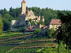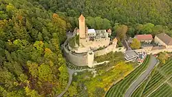 Die Burg Hornberg war nach ältesten Urkunden eine Gaugrafenburg und später eine Ritterburg auf einem steilen 228,6 m ü. NHN[1] hohen Bergsporn über dem Neckartal oberhalb des Ortes Neckarzimmern zwischen Bad Wimpfen und Mosbach. Die Spornburg bestand ursprünglich aus zwei eigenständigen Burganlagen mit gemeinsamer Vorburg, die erst später durch eine Mauer umfasst wurden. Götz von Berlichingen lebte 45 Jahre auf Burg Hornberg, für die er sich schon als Jugendlicher begeisterte. Das zur Burg gehörende, nach Urkundenlage zweitälteste noch bestehende Weingut der Welt betreibt unterhalb der Burg auf Steilterrassen traditionellen Weinbau.