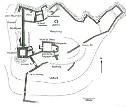 Neben der Toranlage stand innerhalb der Mauer eine dem heiligen Georg geweihte Kirche, deren hufeisenförmige Apsis wohl bis ins 8. oder 9. Jahrhundert zurückreicht. Das erhaltene Mauerwerk der Kirche mit einfachem Saalbau stammt aus dem 12./13. Jahrhundert. Der Chorbogen aus Tuffsteinquadern ist auf der Südseite original erhalten, im nördlichen Teil wurde er 1930 rekonstruiert. An der Nordostecke des Schiffs steht ein schlanker romanischer Glockenturm. Wie eine dendrochronologische Untersuchung ergab, stammt er aus dem Jahr 1070.