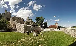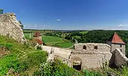 Das unregelmäßige Fünfeck der Außen- bzw. Zwingermauer war durch zwei viereckige und drei – möglicherweise ehemals vier – runde, vorspringende Türme bewehrt. Die Angriffsseite schützte ein winkelförmiger, ca. 5 Meter tiefer und 10 bis 16 Meter breiter Halsgraben. Das Tor lag im Süden nahe dem Steilabfall.