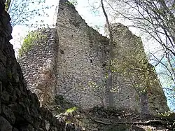 Im Nordwesten liegt hinter der Zwingermauer noch ein Abschnitt des Halsgrabens der stauferzeitlichen Burganlage, über dem der Felsen der Kernburg aufragt. Auf dem Plateau ist als Rest der ersten Burg noch ein 4 Meter hohes und etwa 16 Meter langes Stück der Schildmauer erhalten. Von den sonstigen Gebäuden der ersten und zweiten Burg blieben nur noch einzelne Quader im Umfeld des bis zu 13 Meter hoch aufragenden, nahezu quadratischen Felsstockes. Die ungefähr 3,4 Meter dicke Schildmauer war offensichtlich die Ostwand eines rechteckigen Turmhauses der ersten Burg (Mauerreste). Der Palas des Nachfolgebaues erhob sich wahrscheinlich westlich davon am tiefer liegenden Felsrand.