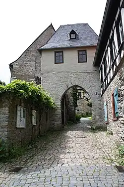 Der Zugang zur Oberburg erfolgt heute über eine Steintreppe aus dem 19. und 20. Jahrhundert, die von der Mittelburgebene aus hoch führt. Wie und wo der ursprüngliche Zugangsweg zur Oberburg verlief, ist unbekannt, da starke Reliefumgestaltungen die Spuren verschwinden ließen. Am Torturm erkennt man einen für die romanische Bauphase charakteristischen Rundbogen aus weißem Kalkstein und schwarzem Lungstein (einem Basaltlavagestein aus dem Vogelsbergvulkan). Die im Torturm hochführende Betontreppe wurde angelegt, um auf das Niveau des über die Jahrhunderte durch Schutt und Abfall angehobenen Innenhof-Niveaus zu gelangen. Der Torturm wird wegen der Torkapelle im Obergeschoss auch Kapellenturm genannt. Der Kapellenraum befindet sich direkt über dem Durchgang und enthält einen kleinen Chor mit zwei Sakramentsnischen, der vom Burghof aus am leicht gerundeten Apsis-Erker erkennbar ist. Dieser Raum ist nicht zugänglich.