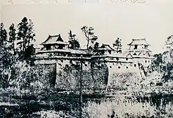 - ↑ Vorne der Hitsujisaru-Wachturm (坤櫓, Hitsujisaru-yagura), also nach den Zwölf Erdzweigen definierten Himmelsrichtungen der Wachturm an der Südwest-Ecke einer Burg beziehungsweise hier des Hommaru, hinten der Tatsumi-Wachturm (巽櫓, Tatsumi-yagura), entsprechend an der Südostecke des Hommaru.