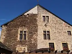 Südwest-Fassade mit Fenstergewänden und Dreipassen in geradem Sturz in Trierer Spätgotik im Westteil (links)