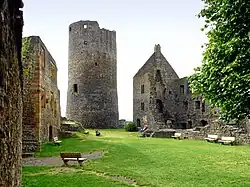 Der um 1260 errichtete westliche Bergfried hat einen Hocheingang in etwa zehn Metern Höhe, ist aber nicht öffentlich zugänglich. Der zylindrische, sich nach oben leicht verjüngende Turm wurde, wie der Ostturm, später erhöht und ebenfalls mit einem Spitzdach versehen, wahrscheinlich aber erst um 1500.[14]