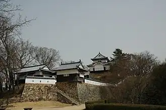 Nach der Schlacht von Sekigahara erhielten Kobori Masatsugi und Sohn Masakazu, letzterer besser bekannt als Kobori Enshū, die Burg als Verwalter (daikan) und begannen ab 1606 mit Ausbesserungen, wobei sie am Fuße des Berges die Residenz One-goya (御根小屋) und oben auf der Höhe die Festung ausbesserten. Nachdem 1617 zunächst die Ikeda als Daimyō die Burg mit 65.000 Koku übernahmen, folgten 1642 die Mizunoya mit 50.000 Koku. Mizunoya Katsumune baute 1681 die Burg groß aus, Mizunoya Sakyō-no-Sukekatsumune errichtete 1683 den gegenwärtigen Burgturm. Die Mizunoya führten das obenstehende Familienzeichen, „Drei linksdrehende Tomoe“.