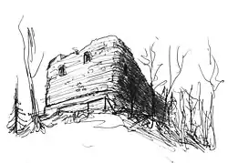 Die Burganlage war kastenförmig mit abgerundeten Ecken und hatte eine Ausdehnung von etwa 30 mal 9 Metern und hatte keinen Bergfried. Von der Burg sind noch der Graben und Mauerreste sichtbar, die eine Höhe von bis zu 12 Metern erreichen. Es ist allerdings davon auszugehen, dass bei den 1904, 1926, 1936, 1954, 1973 und 1991–1994 vorgenommenen Sanierungen Veränderungen gegenüber dem ursprünglichen Bau vorgenommen wurden.[8] Die Mauerstärke beträgt etwas über 2 Meter, wobei auf der gefährdeten Ostseite keilförmig auf bis zu 4,50 Meter verstärkt wurde.