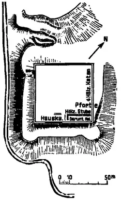 Die Burg war ein quadratisches Lagerkastell mit einer Seitenlänge von 61 m und einer Mauerstärke von etwa 1,6 m. B. Schmid beschrieb 1921 noch Mauerreste mit etwa 10 m Höhe, heute sind diese jedoch deutlich niedriger. Längs der Südostmauer lag ein unterkellertes Steingebäude mit 7 m Breite und unbekannter Länge. Nach einer Beschreibung von 1585 befanden sich hier eine Stube, eine Kammer und eine Hauskammer, die zwischen 1579 und 1582 eingerichtet wurden. An der Nordostseite lagen vier verfallene „Tagelöhner-“ Häuschen aus Holz.